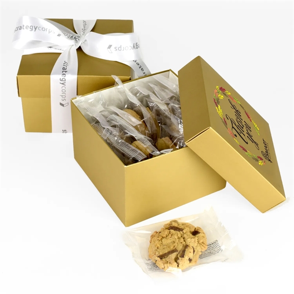 In the market for a decadent treat that can’t be beat? Look no further than our cookie box with printed ribbon. This delicious item comes with a dozen cookies neatly packaged in a gift box, with the printed ribbon prominently displaying your company name and logo for increased brand visibility. Ideal handouts for banquets, tradeshows, conventions and other corporate events, our cookies are sure to satisfy any sweet tooth. During warmer weather perishable items can require special packaging and shipping transit times should be two days or less avoiding the weekends.