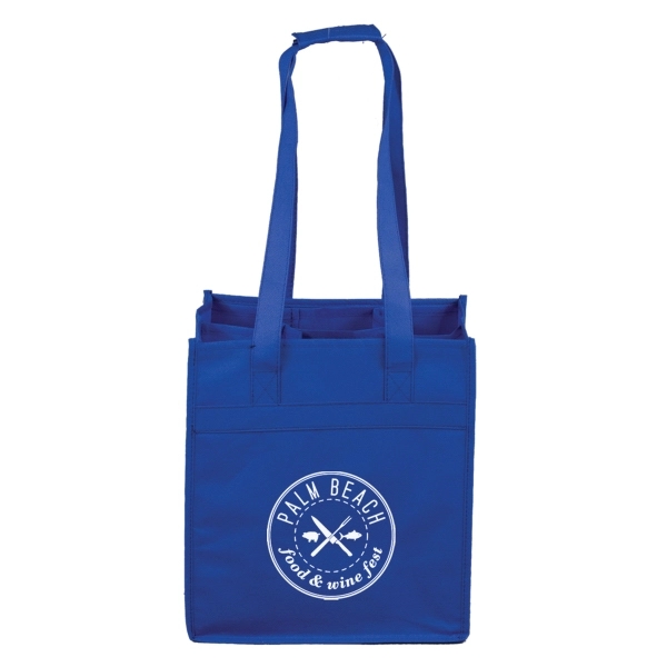 Carry a few bottles of your favorite reds and white in this strong 6 bottle wine tote bag! Made of 90GSM non-woven polypropylene, this tote is washable, reusable and recyclable, and features dividers to protect the bottles from breakage, and the sturdy construction provides stability when transporting. The handles include a hook and loop fastener closure so that the bag is easier to carry when at maximum usage. It also has two storage pockets inside. This tote is an excellent gift for wineries, vineyards, corporate celebratory events and much more. Customize yours with an imprinted company name, logo or message for brand exposure every time it's used!