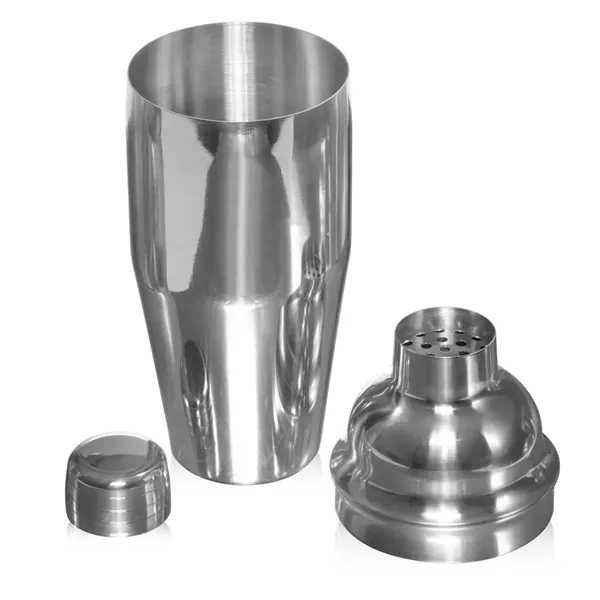 Let everyone know what's shaking with this cocktail shaker as your next great gift! It's made of stainless steel with an all chrome design and holds up to 23.3 oz. of liquid. Make use of the cap to shake without mess, and pour anything you've mixed through the drainer for a delicious beverage. This is a fabulous item to offer to bars and restaurants. It's also great for customers to have at home when entertaining guests. Add your logo to this and provide everyone with something they'll use again and again! Dimensions: 3.5" W x 9.5" H.