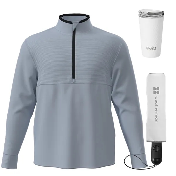 Stay protected and stylish on the course with this all-weather golf set. The Weatherman umbrella offers UPF 50+ sun protection and windproof coverage, crafted from 100% recycled materials. Choose between the women's Ottoman fleece for lightweight warmth or the men's Houndstooth pullover with UPF 50+ protection and anti-pilling fabric. This versatile collection ensures comfort and performance for any golfing conditions, keeping you prepared from sunny mornings to breezy afternoons.
