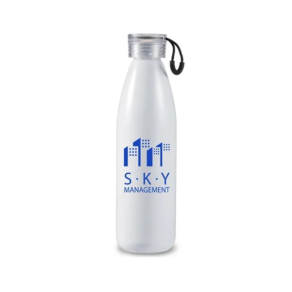 23.66 oz (700 mL) single wall Aluminum water bottle with clear PS Plastic screw on-lid featuring Polyester strap. Hand-wash only. Designed for use with cool beverages only.