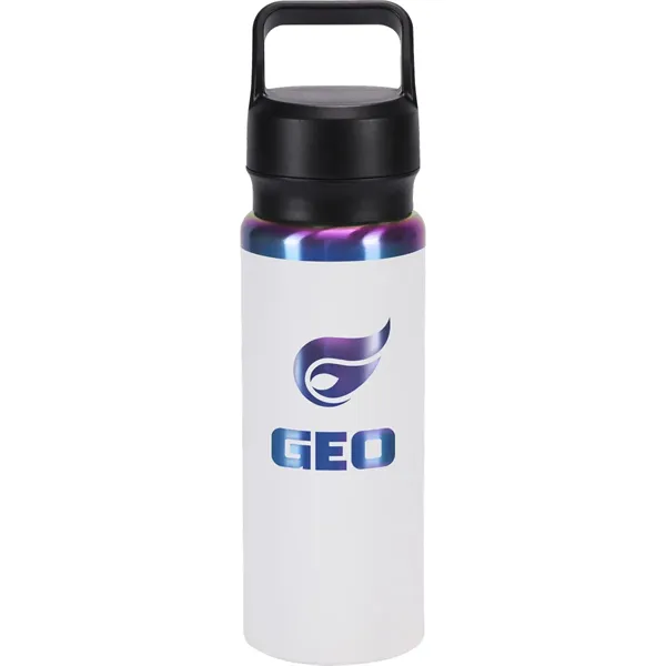Durable Stainless Steel water bottle with rainbow underlay and a dual top PP & Tritan carry handle. Copper lined, vacuum insulated liner maintains drinking temperature. Constructed out of double wall Stainless Steel. Heavy duty, screw on plastic dual top for both wide opening and drinking spout. Lead-free vacuum seal. Sweat-free design. 1-year limited warranty