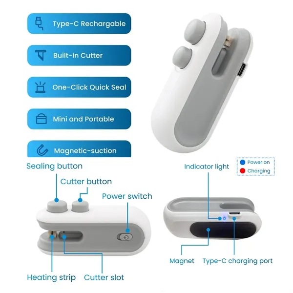 The Mini Button Portable Sealer is a small and handy tool for quickly sealing bags and keeping food fresh. It is made of ABS plastic and comes with rechargeable 200 mAh battery, which can be used for 30 minutes in 1 hour full. Small and lightweight, the sealer measures 3.7 inches x 1.6 inches x 1.4 inches, making it perfect for on-the-go use or storage in the kitchen. Its magnetic back easily attaches to the refrigerator or other metal surfaces for quick and easy access. It can be customized with promotional giveaways or corporate gifts imprinted with your brand logo, making it both functional and stylish. It is the perfect solution for keeping snacks fresh, reducing waste and organizing your kitchen efficiently.The prices for 5000pcs or over are based on ocean shipments