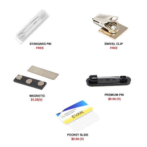 3"W x 1.5"H Executive Name Badges. This professional looking name badge are made with the highest quality USA made plastics and foils available. Fully customizable with digital full color print. Standard attachments include pin and swivel clip. Optional magnetic and premium pin fasteners are also available.