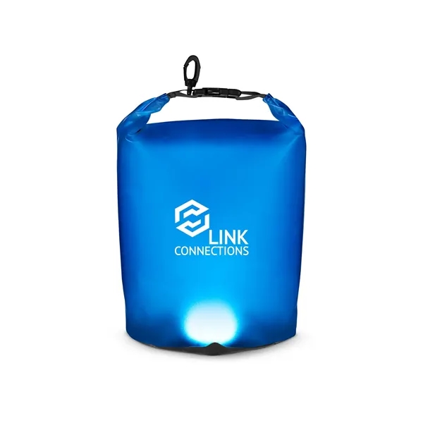 PVC Water-resistant bag designed to keep your property dry. New design featuring COB light to help you find what you need even in the dark. COB with 60 Lumens. Uses 2 button cell batteries (CR2032), included (with battery blocker) and replaceable. Black Plastic buckle closure doubles as handle for easy carry when bag is full and sealed (pull closed buckle). For maximum protection from water, fill dry bag no more than 75%; press black Polyester edges together and squeeze out air; then fold top of bag down at least 3 times and snap buckles together. Recommended weight tolerance: 22 lbs.