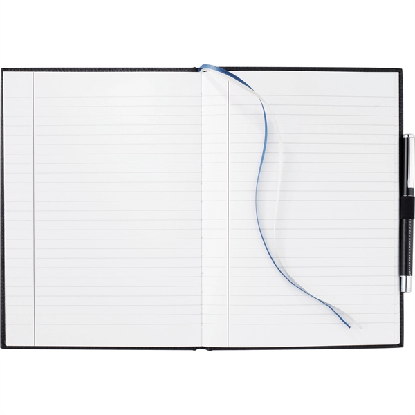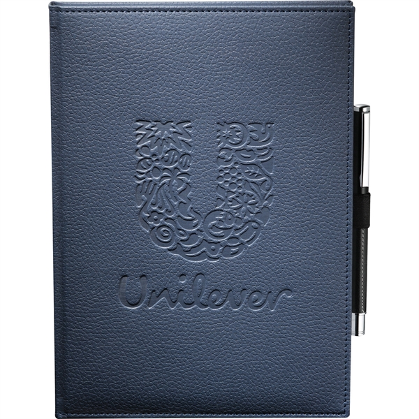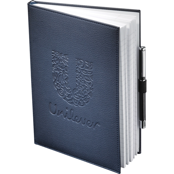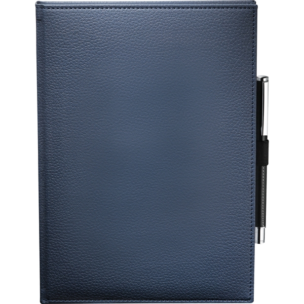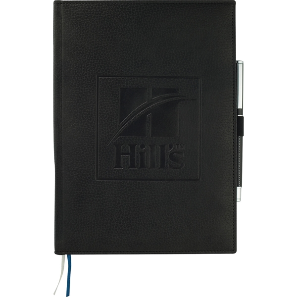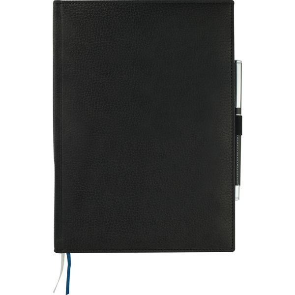 Capture thoughts and ideas in style with the 7" x 10" FSC® Mix Vicenza Large Bound Journal. This sturdy, hardcover notebook boasts 96 sheets of high-quality, white lined paper for ample note-taking space. Its elegant pebble-grain cover, crafted from Italian UltraHyde material, combines sophistication with durability. Practical features include a stretchy elastic pen loop and coordinating blue and silver ribbon page markers for easy navigation.