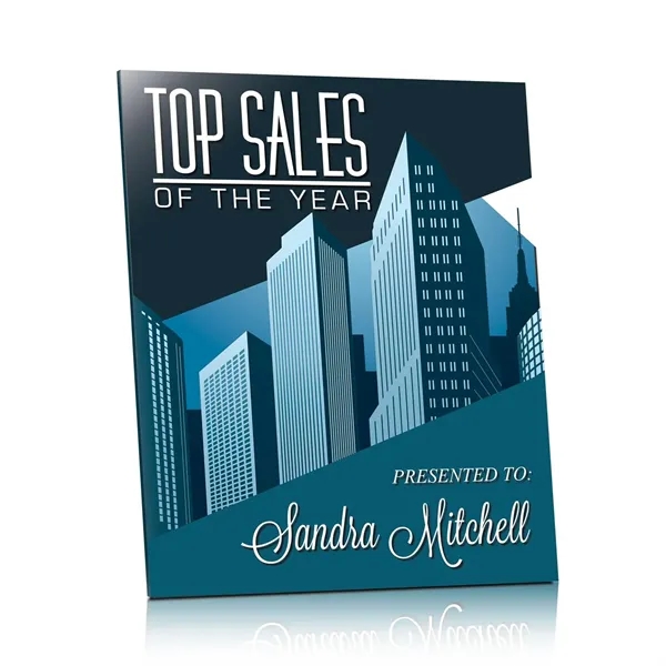 The array of looks you can achieve with this straight-edge plaque are virtually limitless. In addition to full color imprinting on the front, this impressive 1/4" thick acrylic plaque provides the ability to flood the back in full color to create a one-of-a-kind plaque that can be desk or wall mounted.