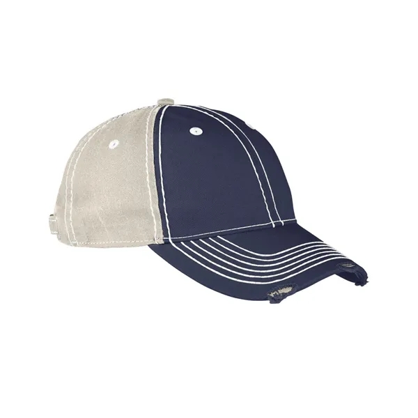 100% cotton twill with contrasting back panels; Heavy enzyme wash;6-panel; Unstructured; Low-profile; Self fabric top button matches back panel color; Self fabric closure with silver sliding buckle and tuck in tunnel; Eyelets match heavy contrast stitching; Heavy raised white contrast color stitching; Pre-curved visor with heavy distressing;