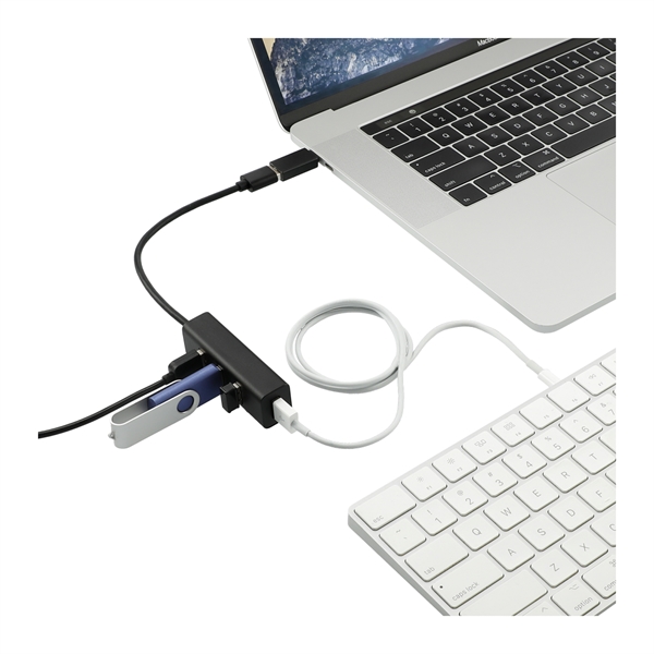 Extend your usable workspace at your laptop station when you plug in this hub adapter to help increase productivity. This adapter is constructed out of an aluminum material with a cable length of 8.375" and an overall size of 11.25" x 0.68" x 0.87". Features of this device include a USB output with a type-C adapter, 4 USB 3.0 ports, and a data transfer speed of 5Gbps. This is a useful item for those who may not have USB ports in their laptops. Connect to your clients when you handout this helpful hub adapter at your next event.