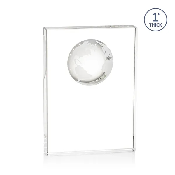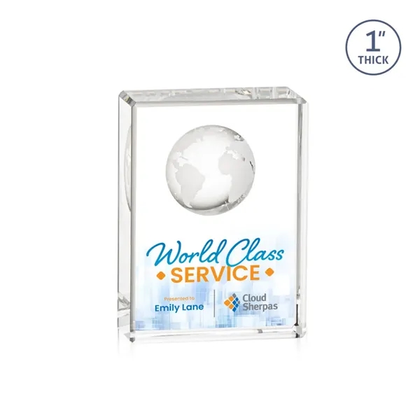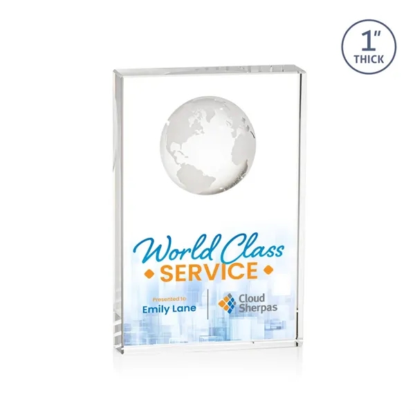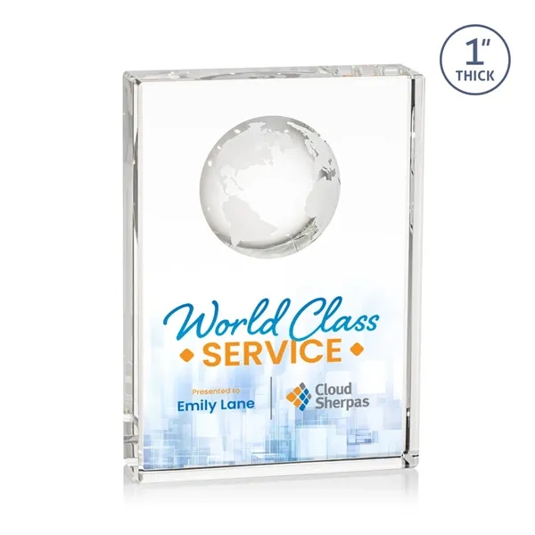 Celebrate global success with our freestanding Optical Crystal Ambassador Globe VividPrint™ Award, featuring a striking 3D world Globe molded into the back for a truly distinctive touch. Perfect for recognizing international accomplishment. Let your artwork shine with full-color VividPrint™!