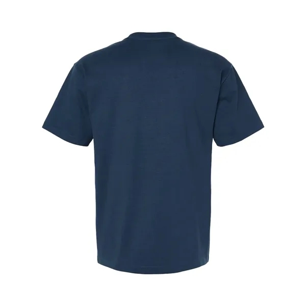 American Apparel Unisex Super Heavyweight Tee ul)9 oz./yd2, 80/20 ring-spun cotton/polyester, 12 singles. Premium heavyweight fabric. Oversize fit. Wide 2" x 2" ribbed collar. Taped neck and shoulders for comfort and durability. Rolled forward drop shoulder. Side seams. Tear away label. Made with respect American Apparel partners with Better Cotton to improve cotton farming globally. Made with OEKO-TEX certified low-impact dyes. We reduce plastic waste by the removal of polybags from all products except color White. This product meets the following Sustainable Style subcategories:Sustainable Manufacturing: This product meets the OEKO-TEX Standard 100.Socially Conscious Manufacturing: This product was made in a facility that utilizes the Higg Index and has implemented Level 2 practices o...