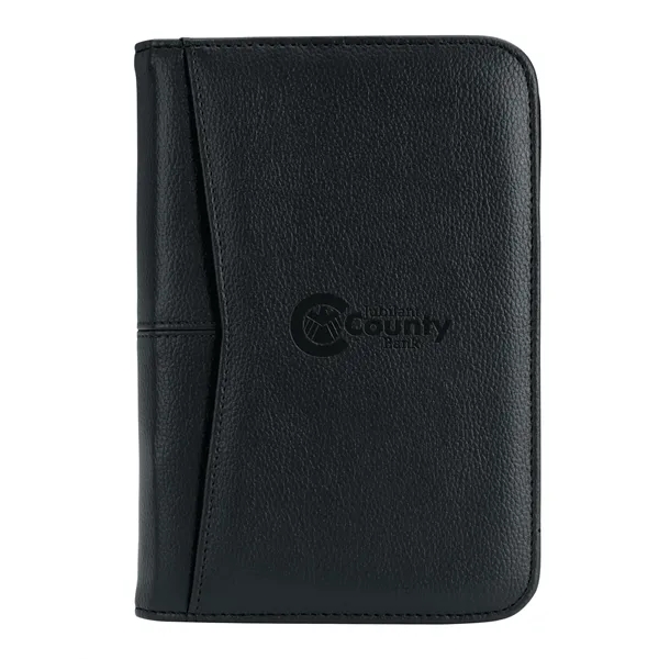 This sturdy compact vinyl padfolio has a textured finish and stitched details to give it a premium look. The interior organizer has lots of options for keeping your business essentials together and includes a 5" x 8" notepad for jotting important information.