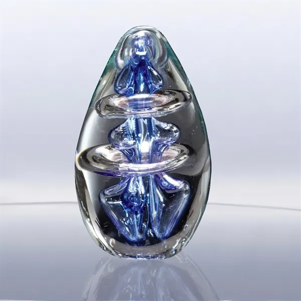 When looking to recognize hard-working employees, consider this gorgeous corporate gift! This 4" x 2.5" x 2.5" glass award takes on a modern and sleek look that any recipient would be proud to display. The eye's attention is drawn to the piece's main focus - an exquisite blue design encircled by clear rings. See your company's logo, message, or employee's name sand etched on to the center of this award. Your desk deserves nothing less!