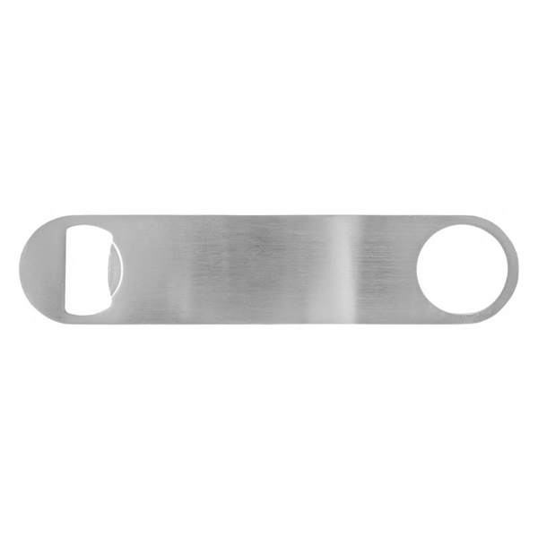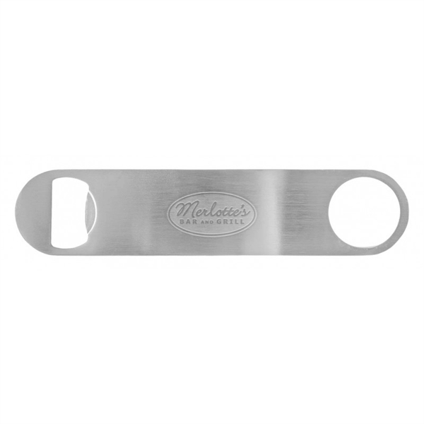 Raise the bar on your next giveaway with this sleek, brushed stainless steel bartender bottle opener. Measuring 7" x 9/16", it's built for speed and durability, featuring a dual-sided design that tackles bottlecaps and pull tabs with ease. The open-end design makes it easy to hang or attach to a keyring, keeping it close at hand for quick use. Available in classic silver, it's a sharp canvas for your logo; a standout gift for bars, beverage brands, or catering teams looking to make a lasting impression.