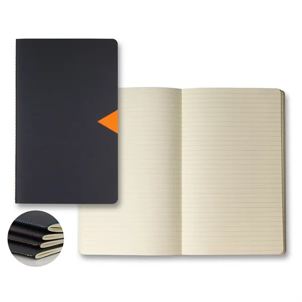 Make your next marketing campaign a success when you offer this Ivory Notch Journal! It measures 5 1/4" x 8 3/8" and comes with 80 ivory sheets of FSC® certified paper with gray lines. It's also equipped with a black die-cut cover showing a colored end-page through the notched area and a matching saddle stitching on the spine. Add an imprinted company name or logo to the item using foil stamping and hand this out to customers who appreciate the value you bring! FSC MIX 70% CQ-COC-000479