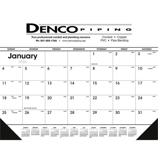 The simplicity of this black and white calendar is prefered by many advertisers. Vinyl corners provide an attractive frame and durability. The FSC® label means that the materials used for this product come from well-managed FSC®-certified forests and other controlled sources.