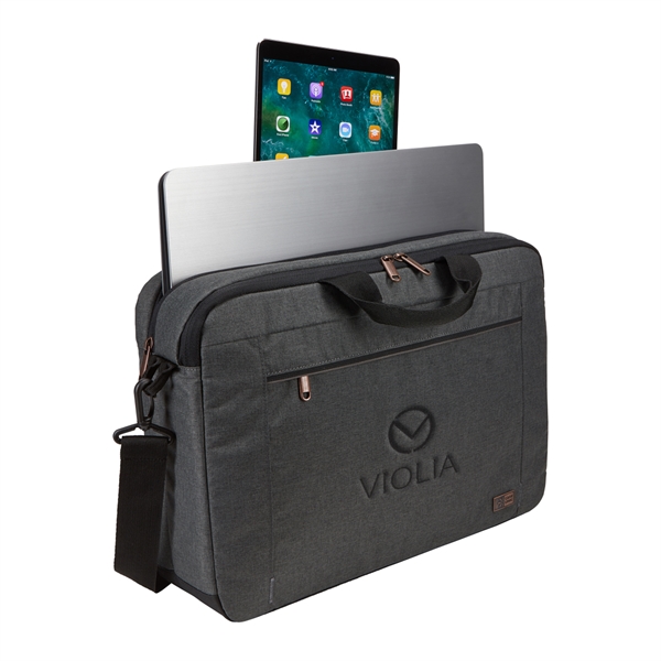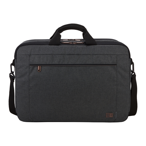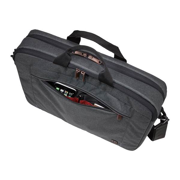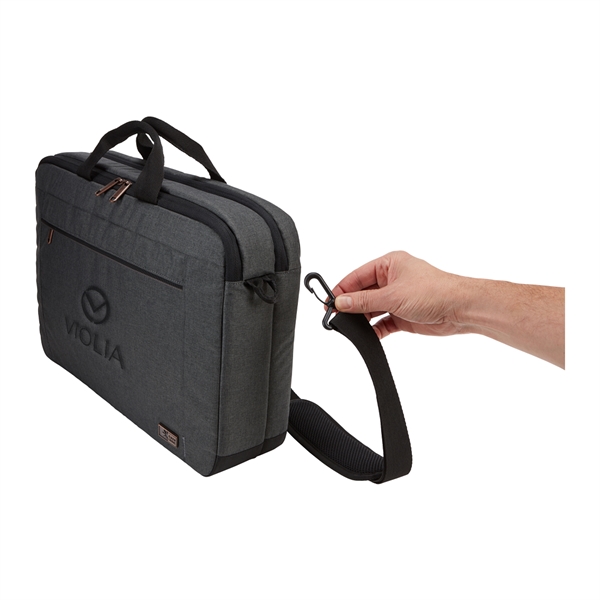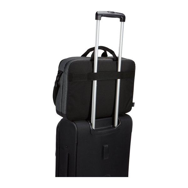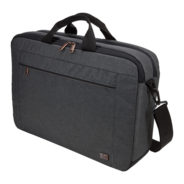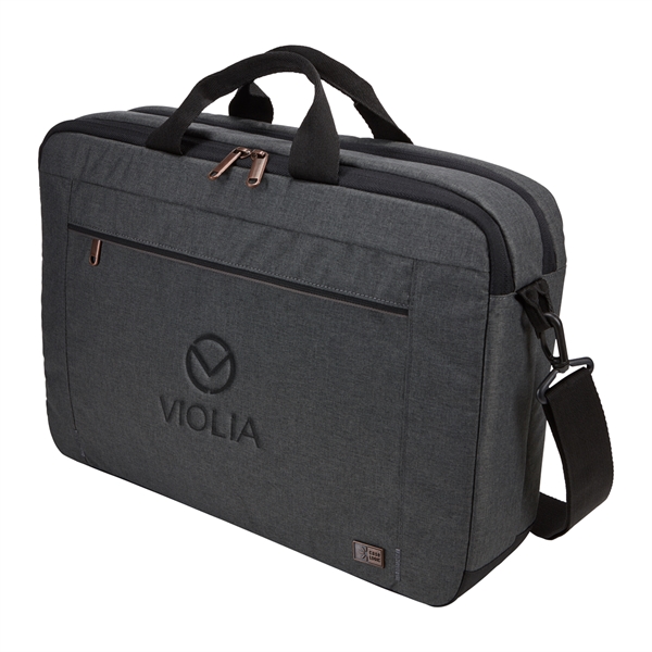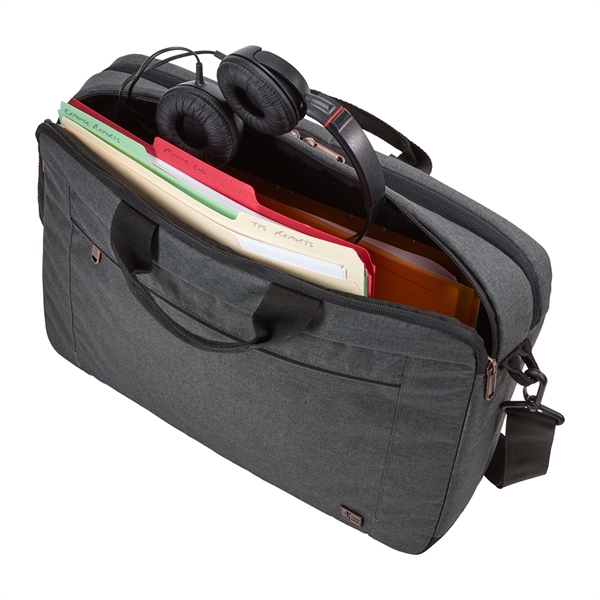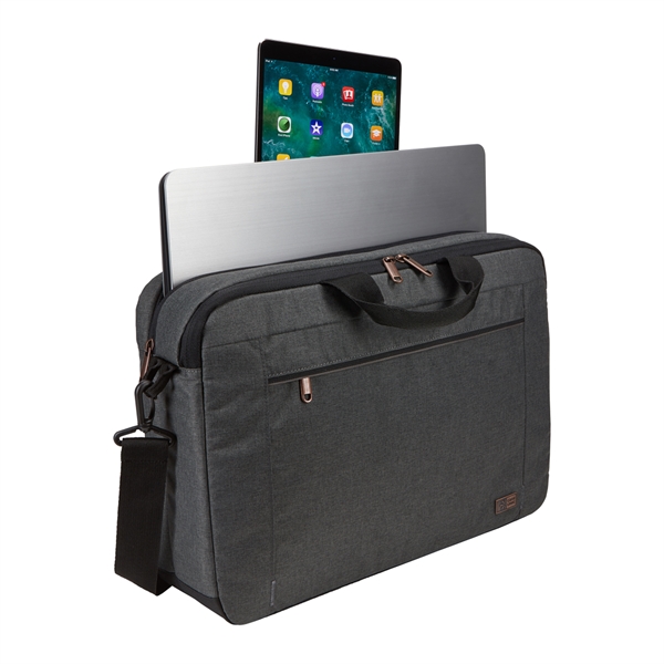 The Case Logic Era 14" Computer Attache is the perfect blend of style and function for the modern professional. This slim, yet spacious laptop case effortlessly holds your 14" laptop, 10.5" tablet, and everyday essentials. The padded compartments and quick-access pockets keep your devices secure and organized, while the adjustable shoulder strap and comfortable carry handles make transportation a breeze. Sleek melange fabric, copper accents, and a convenient luggage strap complete the sophisticated look and functionality of this must-have accessory.