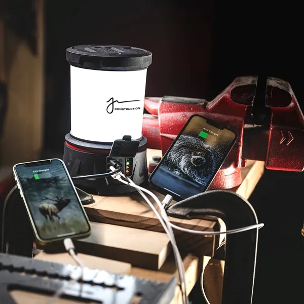 The EAL40R provides multiple ways to control its high-powered light with a max brightness of 2500 lumens. This lantern has multiple light modes-warm low, warm medium, warm, cool low, cool medium, cool high, red, red flashing. Easy to carry handle and an integrated for hands free hanging. Operates on a rechargeable battery, that recharges via a USB-C in/out port and works as a powerbank for small devices. The light can also run on six AA alkaline batteries (purchased separately). Constructed of top-grade materials, the EAL40R is rated IP54 water-resistant and dust-resistant. Boxed. Pad print 1-2 colors. Price includes 1 color, upcharges apply for second color.