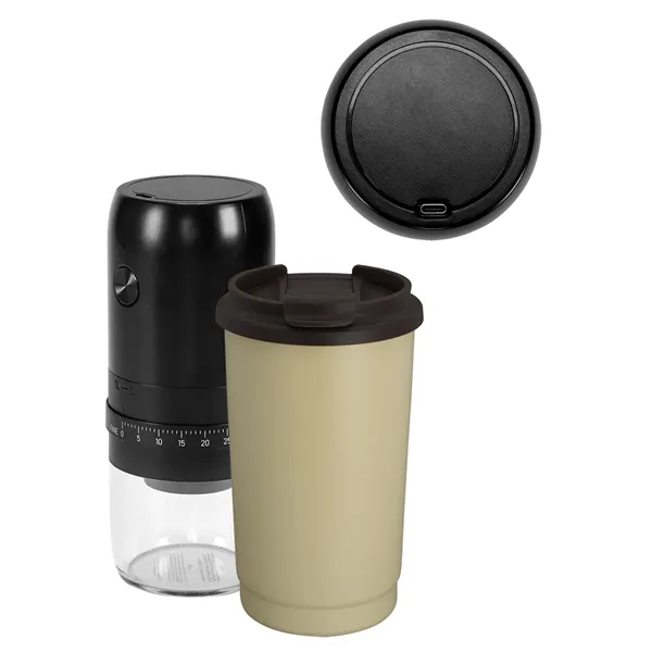Features the Rechargeable Coffee Grinder (HW58) and EarthTrendz™ 14 oz Recycled Stainless Steel Tumbler (SL185PR) packaged in a gift box Coffee grinder features automatic grinding and 40 adjustable settings for a coarse to fine grind Tumbler includes copper-lined vacuum insulation, maintaining 9X optimal drinking temperatures with a snap closure, screw-on recycled PP lid