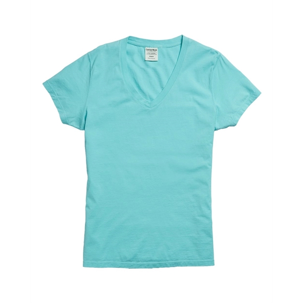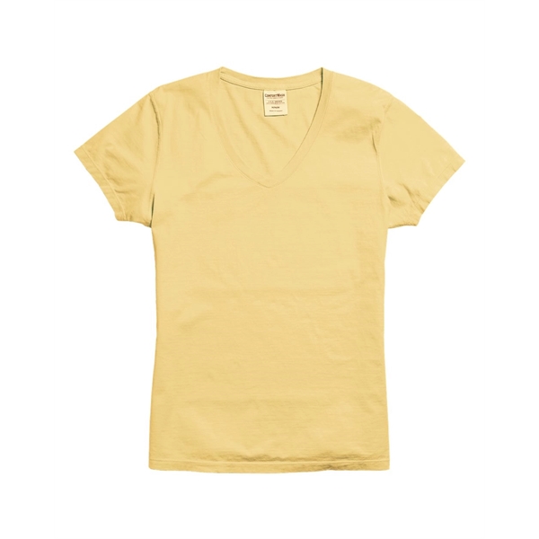 ComfortWash by Hanes Women's Garment-Dyed V-Neck T-Shirt ul)5.5 oz./yd2, US grown, 100% ring-spun cotton. Pre-shrunk. Contoured and side-seamed for feminine fit. Mitered V-neck, coverstitched with lay flat collar. Shoulder-to-shoulder twill tape. Double-needle sleeves and bottom hem. Twill label. ComfortWash tees and sweats deliver garment dyed tones with a vintage washed softness.. This product meets the following Sustainable Style subcategories:Sustainable Manufacturing: This product was made in a facility that is run by at least 50% renewable energySocially Conscious Manufacturing: This product was made in a facility that utilizes the Higg Index and has implemented Level 2 practices or above, and was made by a mill that has partnered with or is accredited by the Fair Labor Association