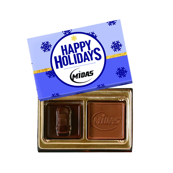 They'll see, feel and taste your customer dedication with this memorable advertiser! Our 5 oz. budget conscious chocolate squares gift box comes with your choice of two milk and dark chocolate stock themed 3D pieces, a custom logo or both. Each is packed in a custom full color gift box. Great for promotional events, with one bite your customers and potential clients will be won over! Dimensions: 9 1/2" x 4 1/2". Kosher certification available.