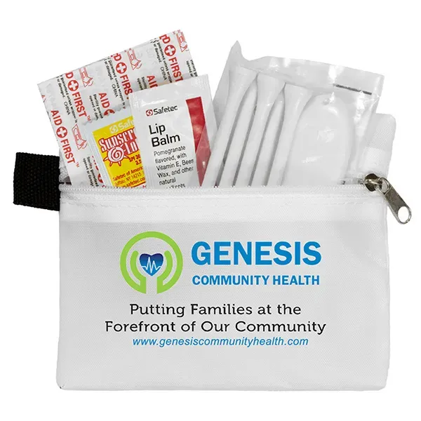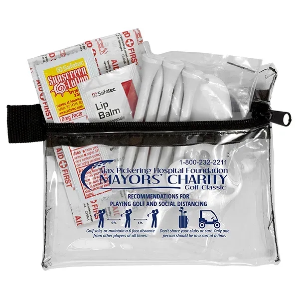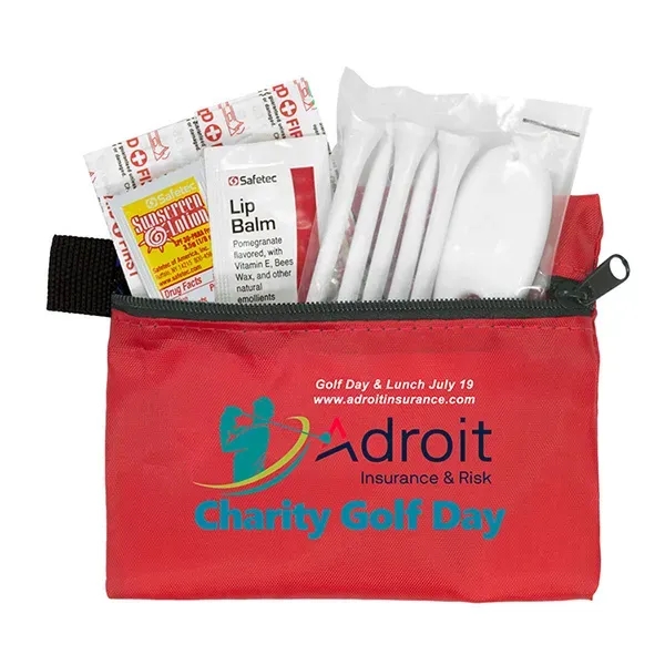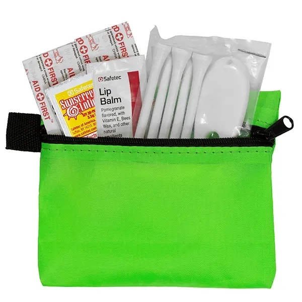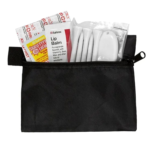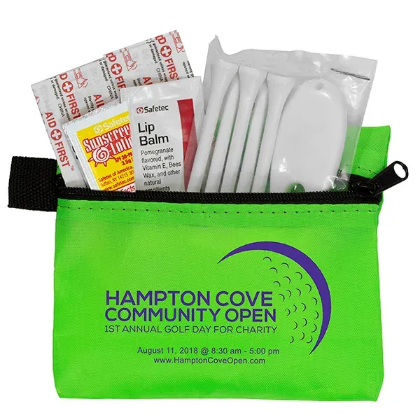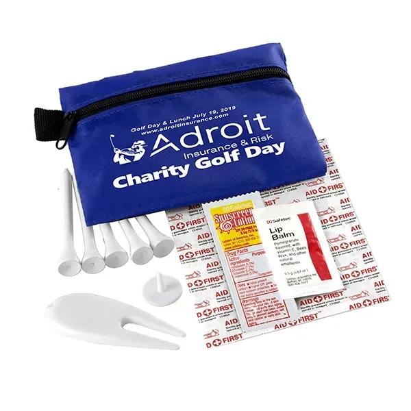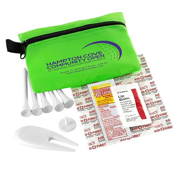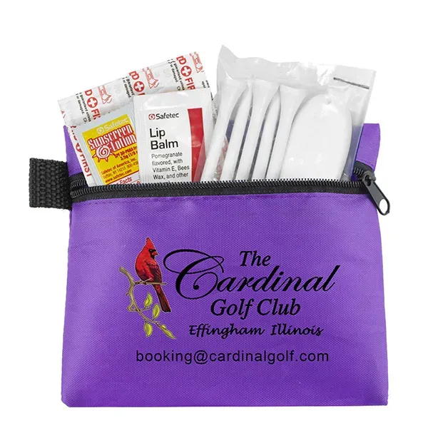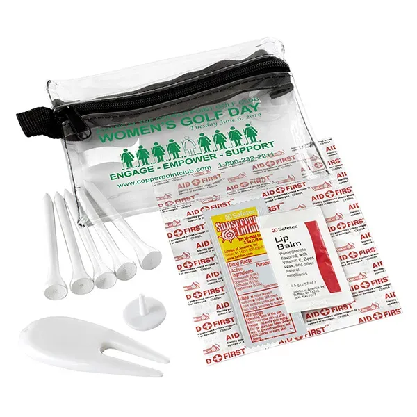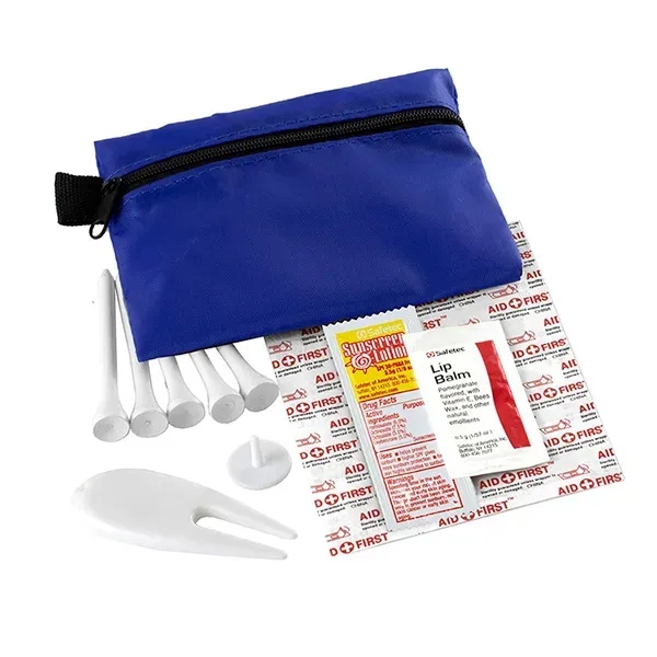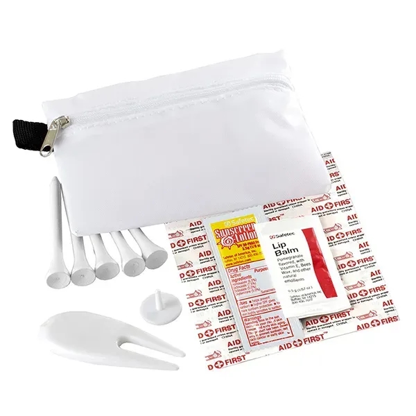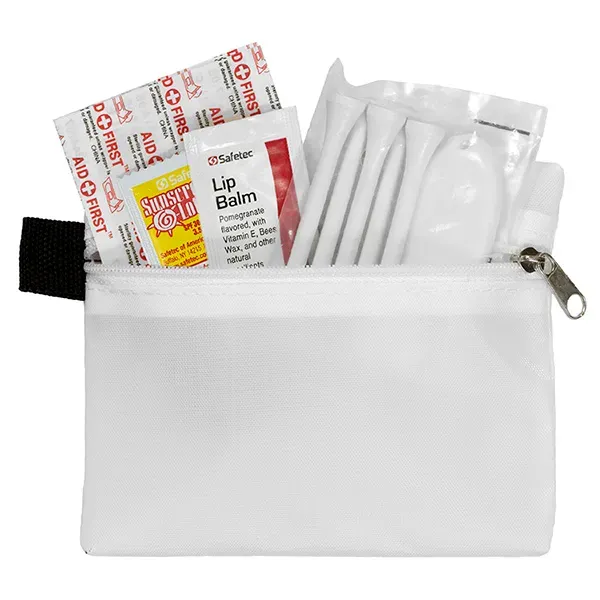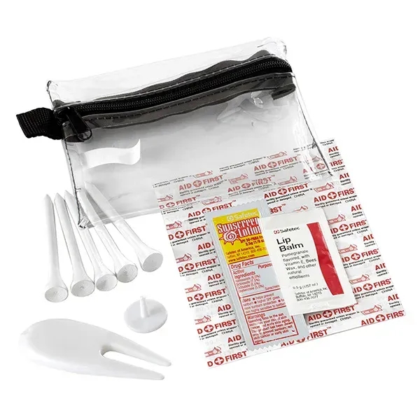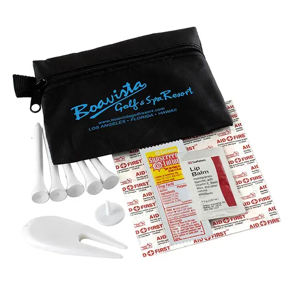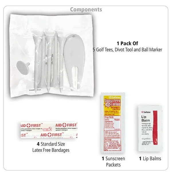 Golf with confidence knowing that you have everything you need to keep your game on track. Small size for convenient carrying. This zippered pack contains: 1 Golf Divot Tool, 5 Golf Tees, 2 Ball Markers, 4 Standard Latex Free Bandage, 1 Sunscreen Packet & 1 Lip Balm.