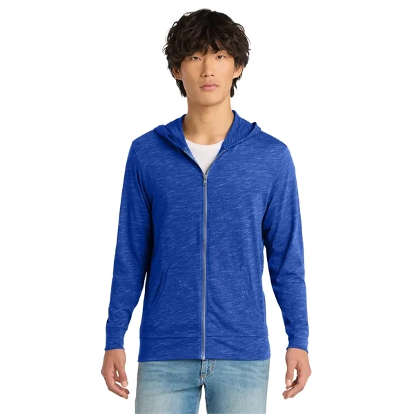 District Medal Full-Zip Hoodie. Strengthen your style impact with this lightweight hoodie made for ease and versatility. 4.9-ounce (165 GSM) 90/10 combed ring spun cotton/poly, 30 singles Tear-away label Self-fabric back neck tape YKK Metaluxe zipper Front pockets Self-fabric cuffs and hems