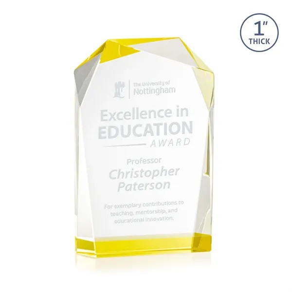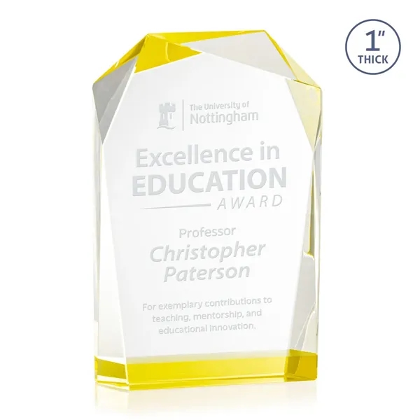 The elegant freestanding Donvale award features a modern geometric design with beveled edges and a vibrant gold accent at the base that reflects throughout the top bevels. Crafted from optical crystal, its asymmetrical angles catch the light beautifully, creating a striking visual effect. Available in three sizes, it's perfect for recognizing excellence with a sophisticated and contemporary touch.