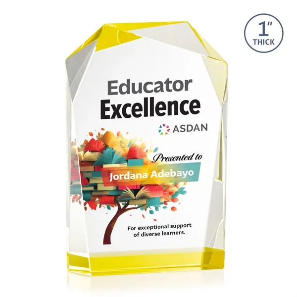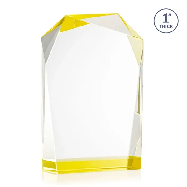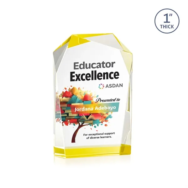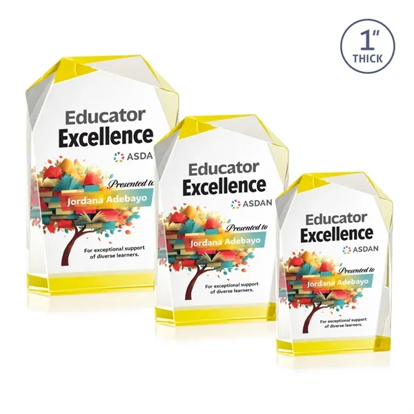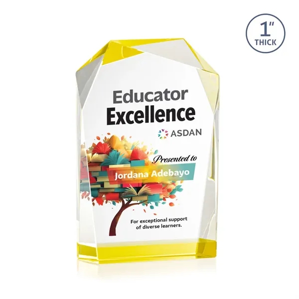 The elegant freestanding Donvale VividPrint™ award features a modern geometric design with beveled edges and a vibrant gold accent at the base that reflects throughout the top bevels. Crafted from optical crystal, its asymmetrical angles catch the light beautifully, creating a striking visual effect. Available in three sizes, it's perfect for recognizing excellence with a sophisticated and contemporary touch. Bring your artwork to life with full-color VividPrint™!