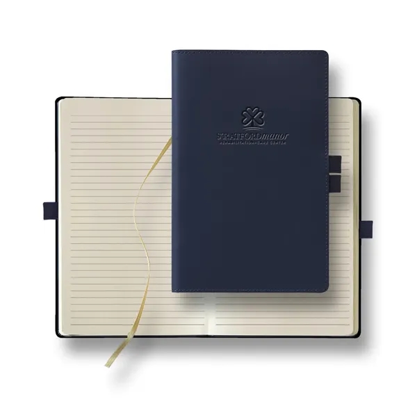 Make a lasting impression at your next event with the Double Medium Ivory Journal! This stylish and professional journal measures 5 1/4" x 8 3/8" and features a bonded leather cover with stitching, a pen loop, elastic closure, and lined pages in gray print on 224 pages of FSC® certified ivory paper. It also comes with a pen, pen loop, back paper pocket, and a gold ribbon marker. It's the perfect giveaway for seminars, business meetings, tradeshow giveaways, and much more. It's a great way to promote your brand and show your appreciation for your customers and clients.