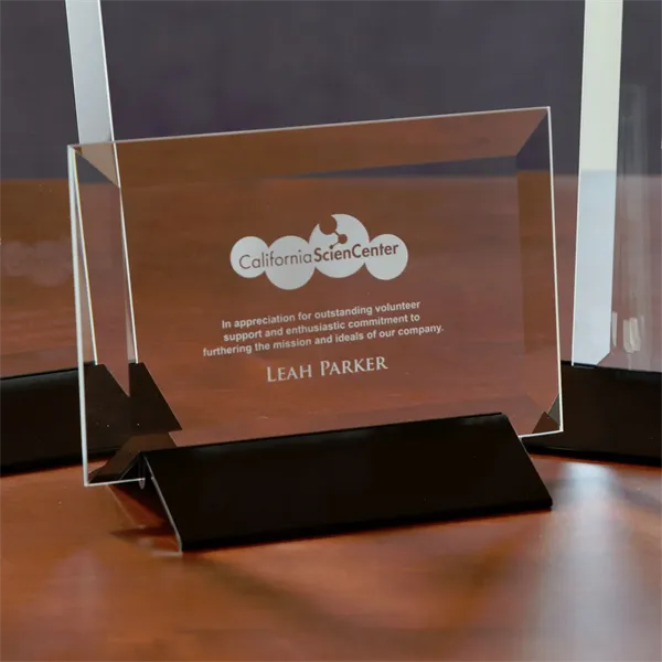 Highlight an employee's finest hour with this impressive award! Crafted out of glass, the Epoch Award measures 4" x 6" x 3" and features a horizontal orientation with beveled edges and set in a black base. It will proudly stand as a symbol or accomplishment and can be admired for years to come. Customize each award with an individual's name, corporate logo, message and more!