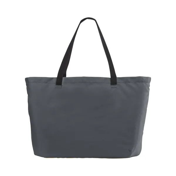 Recycled Polyester tote with a message. Carry inspiration with you, this stylish tote bag features a bold contrasting color base and a hidden surprise inside - a motivating 'Carpe Diem' message to brighten your day. Two inside slash pockets. Includes two long web carry handles on the outside and two shorter ones on the inside. Hand wash only. Recommended weight tolerance: 19.5 lbs.