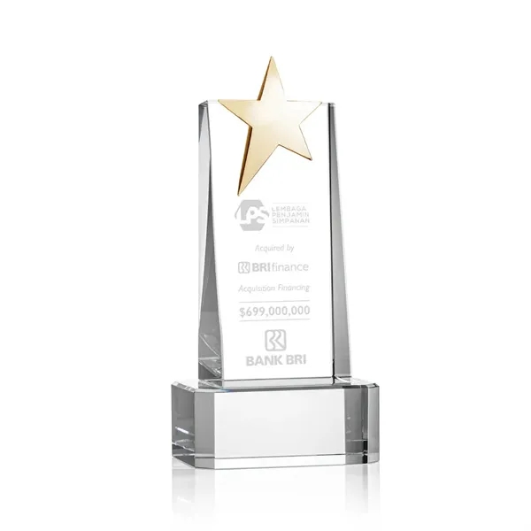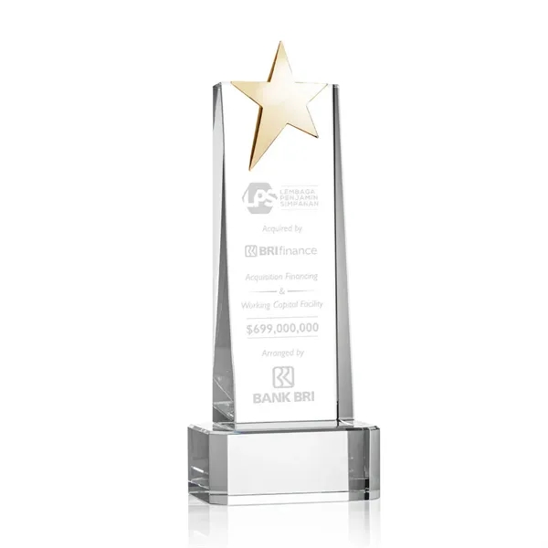 The Fanshaw Optical Star Award is a spectacular recognition piece for an outstanding achievement. Crowned with a high polished gold star and mounted on an extra-thick Optical Base to create a grandiose crystal tower to commemorate your success. Second Position Etch Optional.
