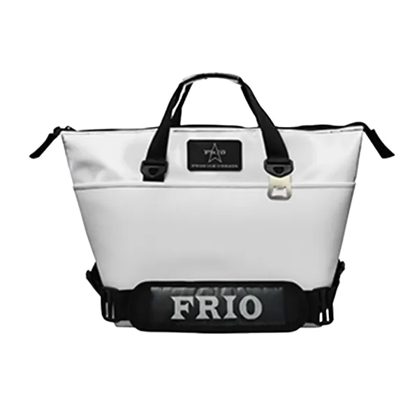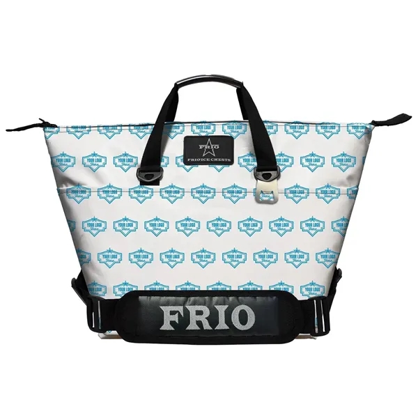 The FRIO 30 Can Softside Cooler offers ample storage and exceptional cooling performance. This well-insulated, hand-made cooler maintains ice for up to 48 hours, making it perfect for extended outdoor activities. It includes two spacious pockets on the front and back, clear wrapped easy grip handles, and a comfortable nonslip shoulder strap with swivel snaps for easy adjustment. A bonus steel bottle opener is sewn into the left front tab. With full coverage customization available through dye sublimation, this cooler can be personalized to showcase your brand or style.