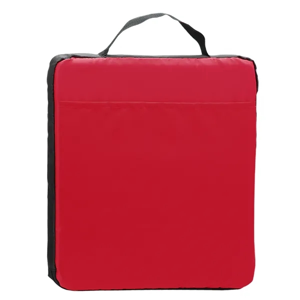Cheer on your team in comfort with this 1.5" thick polyester fabric stadium cushion. It features a convenient front program pocket for quick storage and a built-in handle for easy carrying. It's a must-have for sporting events, concerts, or outdoor activities.