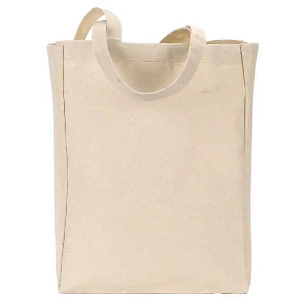9 oz. cotton canvas;22" handles; Double-reinforced open top; Bound inner seams; CPSIA compliant; 9"w x 10"h approx. front and back imprint areas; 5 1/2" diameter max. front and back embroidery areas; Product Size: 11"l x 15"h x 5"w;