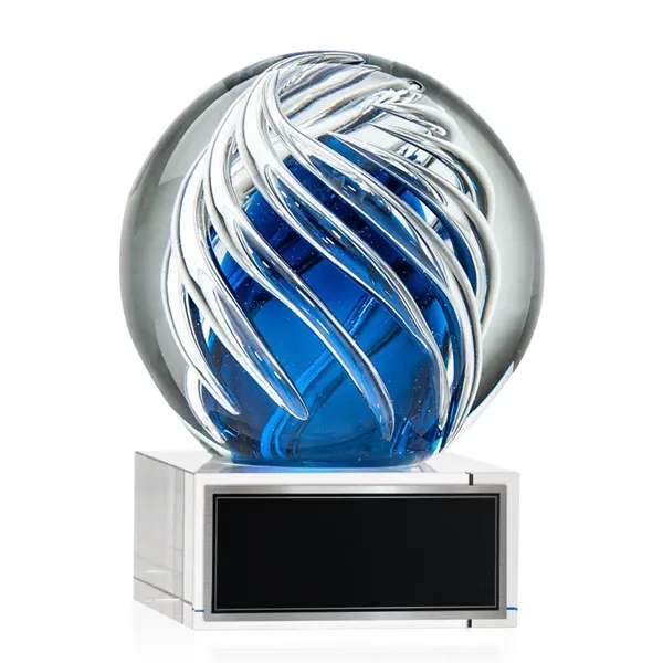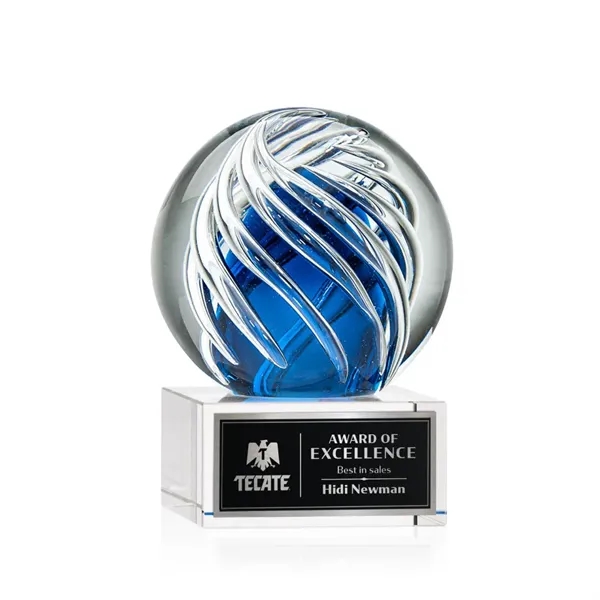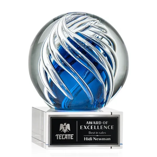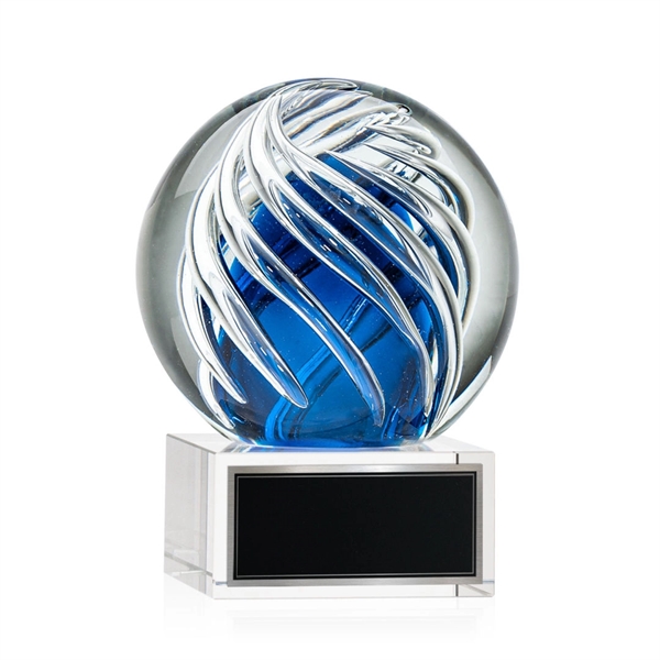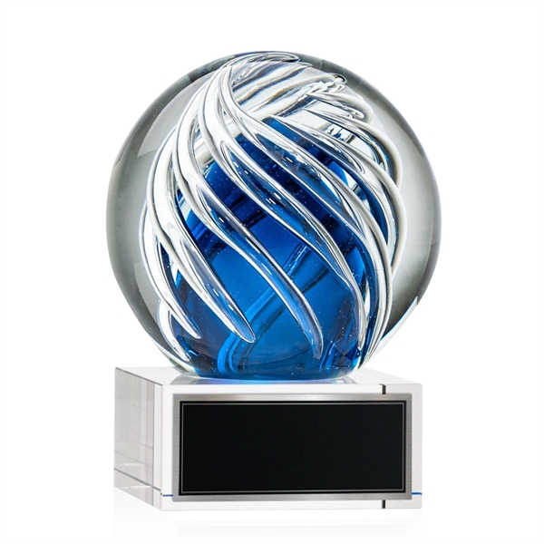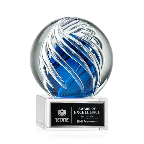 The Genista art glass awards on Hancock base features twisting clear swirls wrapped around an opulent sapphire center for a radiant display of achievement recognition. Available in clear, black and blue bases. Other base options available.
