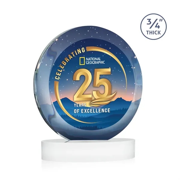 The Gibralter VividPrint™ is a perfect 3/4" thick Starfire circle framed by a soft beveled edge that highlights your words of achievement. Mounted on a beautiful oval crystal base in your choice of distinct colors.
