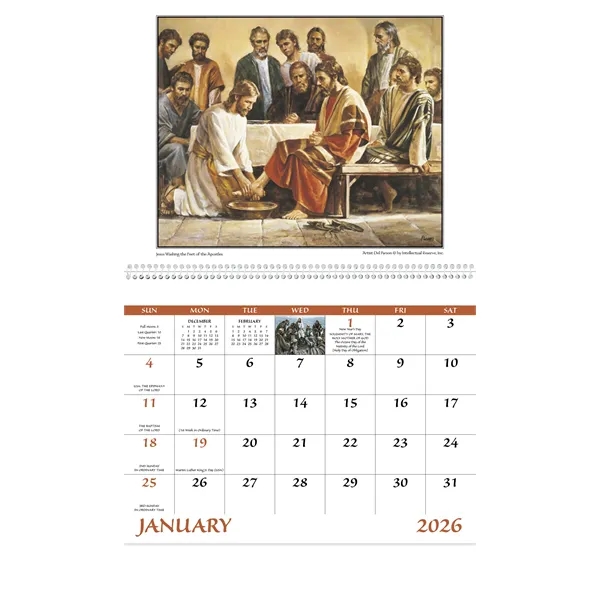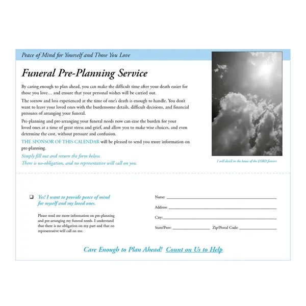 Roman Catholic observances are noted on this 12-month calendar. A funeral pre-planning form is included. The FSC® label means that the materials used for this product come from well-managed FSC®-certified forests and other controlled sources.