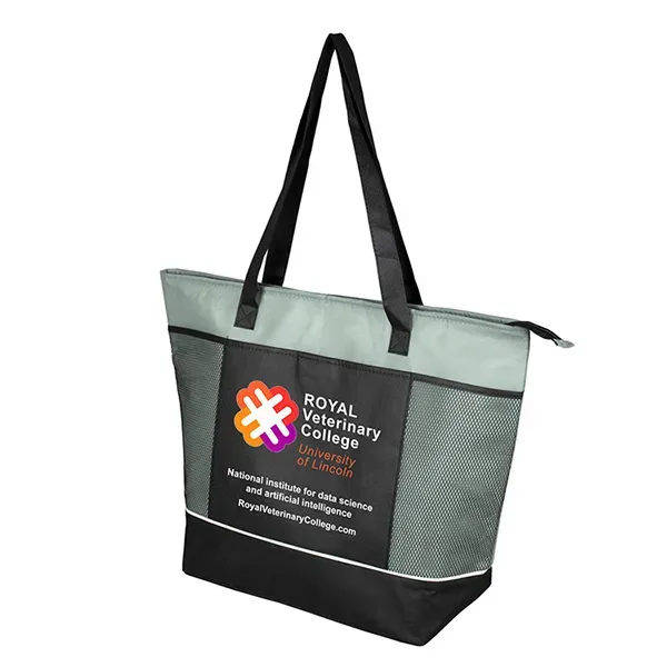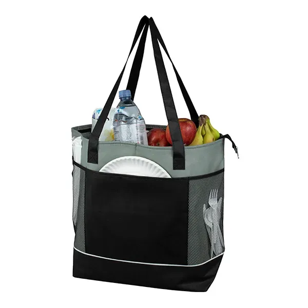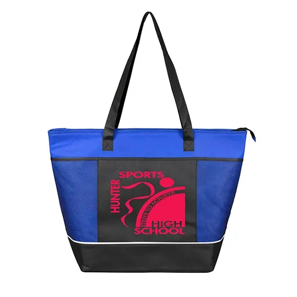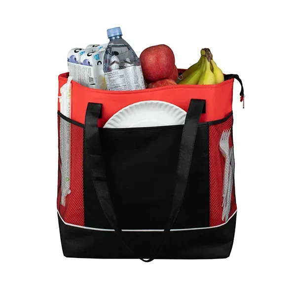 Bring along a bunch of lunch or enough drinks for the whole crew in these roomy insulated tote bags. Crafted from 80GSM non-woven polypropylene, these 16" x 22" x 7 1/2" FROST LINE totes have a foil laminated PE interior that maintains the temperature of up to 20 cans of soda or the equivalent in food and snacks. Features a zipper closure, two mesh side pocket and long dual carrying straps. Available in assorted colors. Add your organizational or company logo or message through our PhotoImage™ process to customize.