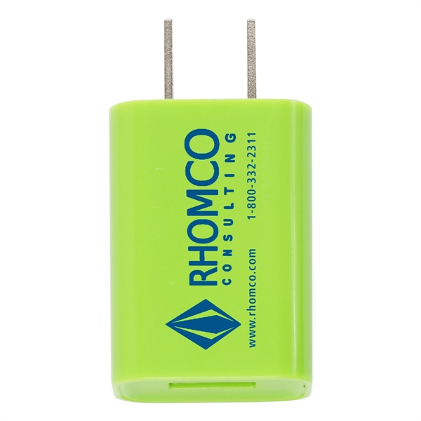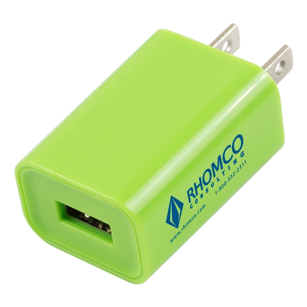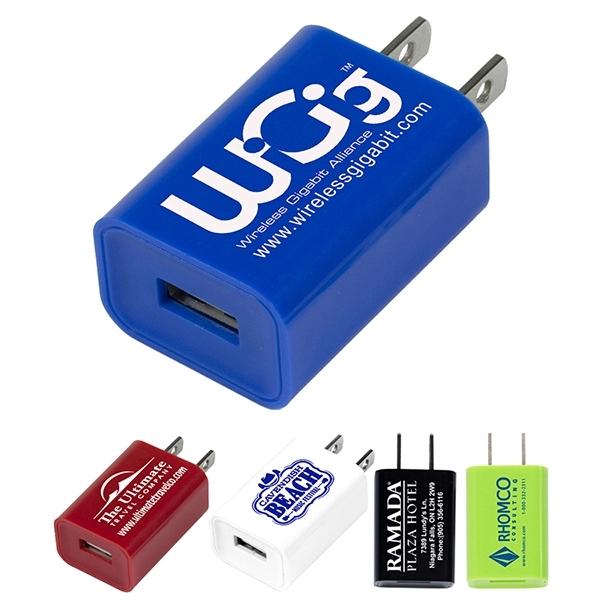 Transform a humble wall outlet into a high-tech charging station with this cool and colorful adapter that fits in the palm of your hand. The Hamburg1 5/8" x 1 3/16" plastic plug has a USB port that you can use with or without a cable to charge up and top off cellphones, laptops, tablets, videogames and other tech. 5V/1A output means quick and efficient charges. Select from six great shades and add your school, sports team, organizational or company logo or message. UL listed.