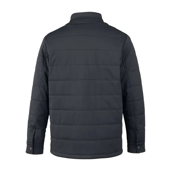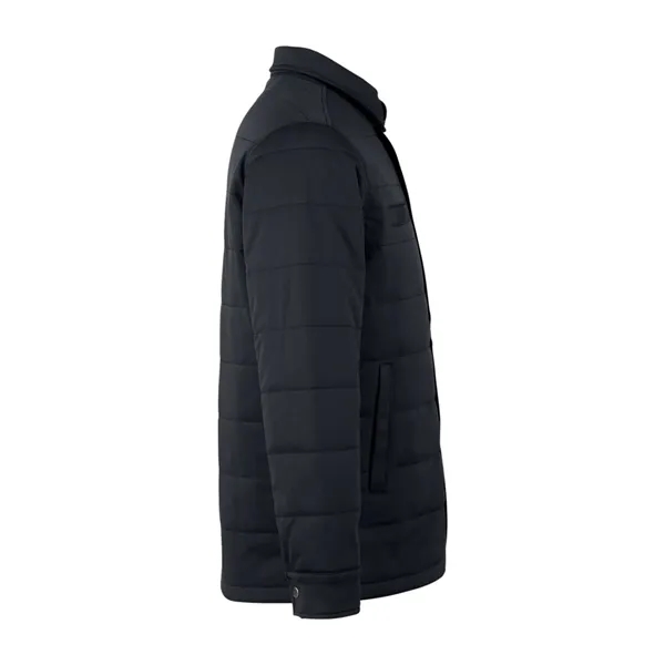 Harriton Unisex Guardian Soft Shell Chore Coat ul)8 oz./yd2/270 gsm (US), 13.4 oz./L yd (CA), 3-Layer 100% polyester. Polyester Interlock bonded to polyester birds eye with inner membrane. 4.1 oz./yd2 thermal poly fill. 8,000 mm waterproof rating. 1,000 g breathability rating. Water-resistant. Center front storm flap with metal snaps and hidden coil zipper . Right chest and lower pockets with metal snap. Inner storage pocket. EZEM™ System for embroidery access.