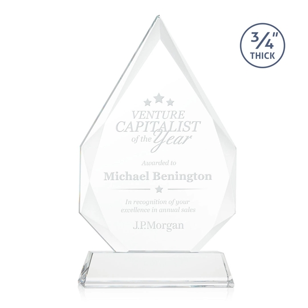 The classic Hawthorne 3/4" thick Starfire Crystal Award is the pinnacle of achievement recognition. Brilliantly beveled to highlight your message with interchanging facets that rise to a sparkling peak. Available on your choice of clear or colored tall tapered base. Second Position Etch & Colorfill optional.