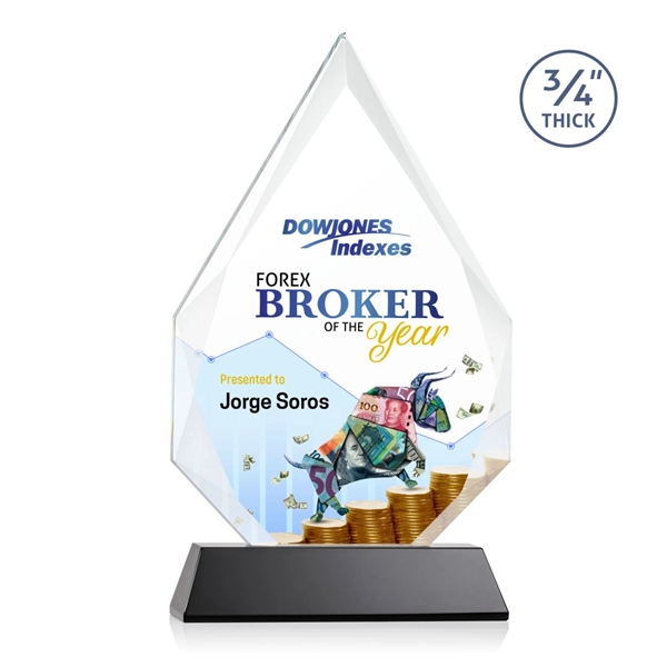 The classic Hawthorne 3/4" thick Starfire Crystal Award is the pinnacle of achievement recognition. Brilliantly beveled to highlight your message with interchanging facets that rise to a sparkling peak. Available on your choice of clear or colored tall tapered base. Second Position Etch & Colorfill optional.