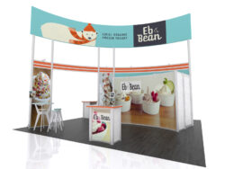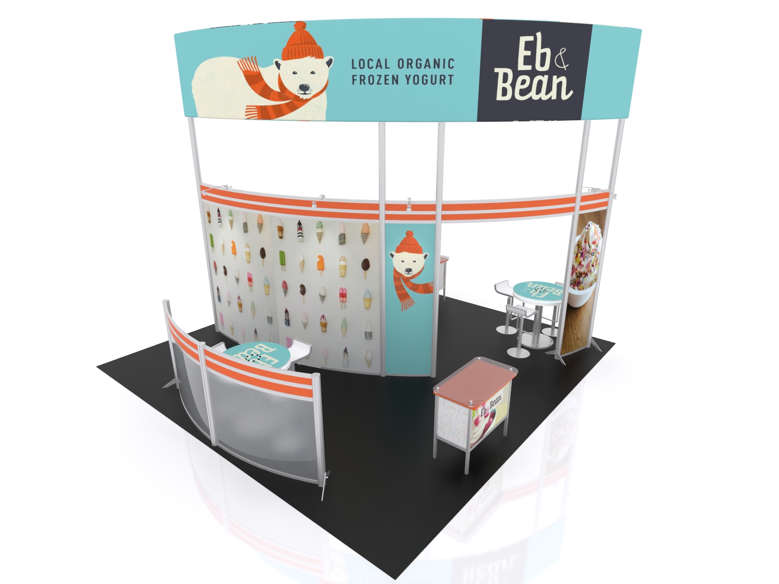 When it comes to island exhibits, sometimes a simple approach is better. The VK-5131 has a large 23 ft. long x 16 ft. high curved two-sided curved header for maximum visibility. The island design includes two modified MOD-1552 reception counters and MOD-1432 Bistro Charging Tables with Branding. In addition, there’s a oversized closet with a full-size door for storage. All that would make for a pretty impressive island exhibit, except you need a place to sit down with your clients to negotiate that whopper multi-million dollar order.