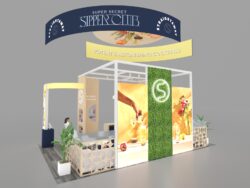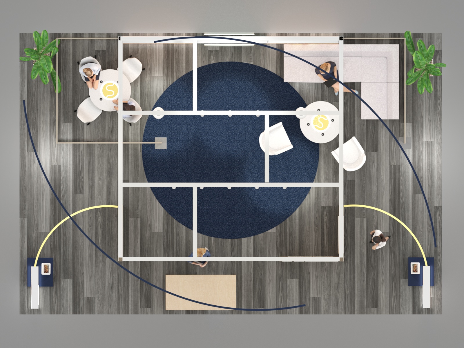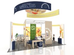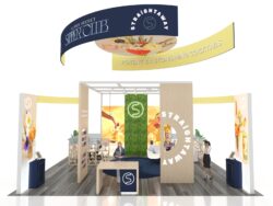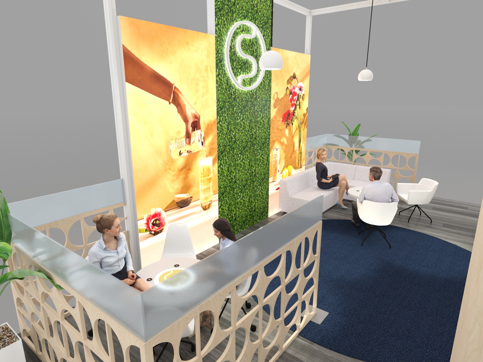 In a trade show environment increasingly dominated by video, lights, and hi-tech, an island design that evokes casual and comfortable is a welcome oasis on the show floor. The VK-5183 and VK-5186 embrace a relaxed vibe with casual seating meant for lingering conversations with attendees. In addition to the two seating areas, the design features multiple double-sided lightboxes with vibrant fabric graphics, iPad swivel mounts for demos, and ample product displays shelving. The overhead hanging signs are guaranteed to attract attention drawing attendees to the booth from throughout the hall.