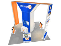 No one has ever said the following about an exhibit design, “Don’t be dramatic!” The VK-5169 thru VK-5171 series is spectacularly dramatic with a 16 ft. backlit tower and lightboxes. Who needs an overhead sign when your booth shines bright and your logo can be seen from across the show hall? But it’s more than just a pretty face. It’s inviting, informative, and practical. Depending on the version, it includes a large walk-in closet, monitor mounts, reception counter, bistro table with wireless charging, and interactive kiosks. The large fabric graphics are easy-to-install and the colors vibrant. Choose from several floorplans. And as with every rental, the exhibit can be customized to match your trade show marketing goals.