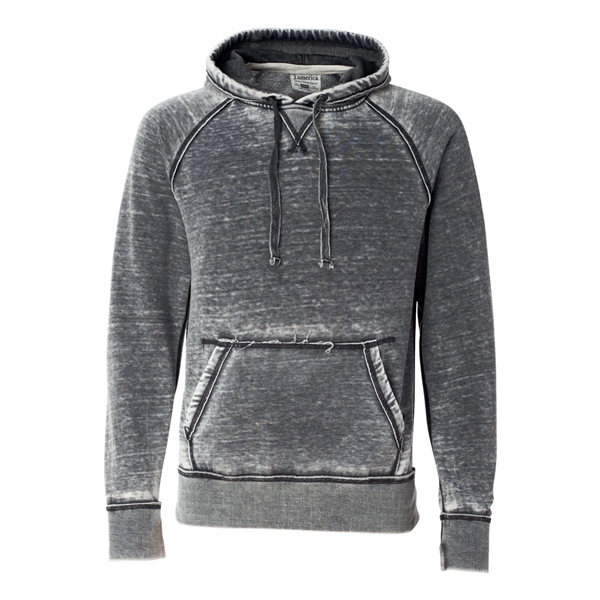 J. America Men's Vintage Zen Fleece Hooded Sweatshirt ul) 7 oz./yd2, 55/45 cotton/polyester burnout fleece. Acid washed with silicone finish. Flatlock-stitched throughout. Dyed-to-match drawcord. V-notch collar. Raw-edge seams around hood opening, shoulders, pocket seams, cuffs, waistband and side seams. Raglan sleeves. Pouch pocket.