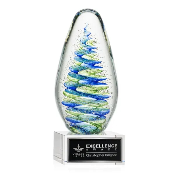 Elevate your recognition with our breathtaking blue and green swirl design art glass award, a stunning masterpiece hand-blown to perfection. Accompanied by your choice of base for personalized engraving with a logo or name, each piece embodies individuality and craftsmanship. Individually hand-crafted, no two awards are alike, ensuring a unique and captivating symbol of achievement for any recipient.