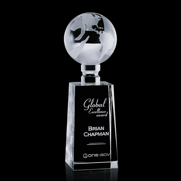 A gift that's in a world all its own! The Juniper award showcases exquisite artistry in a memorable keepsake by featuring an optical crystal globe mounted on a tall base. What a wonderful way to show your appreciation to valued employees and clients. Individually deep etched by hand, you can be certain that your personalized message and/or logo garners attention time and again when you give this worldly gift! Available in 3 size options.